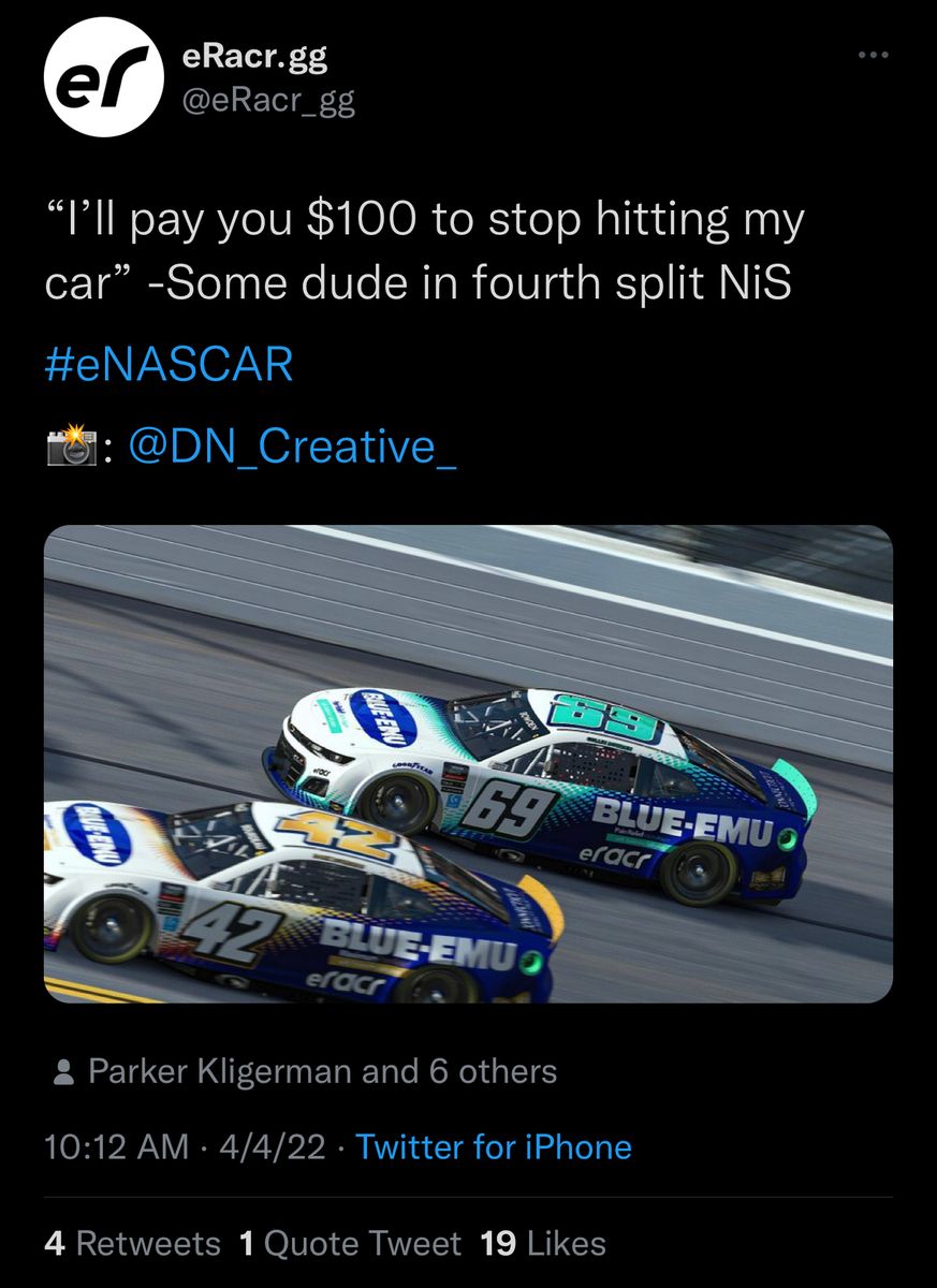 This week's social spotlight is a message from yours, truly. PLEASE stop wrecking our cars in the eNASCAR Coca-Cola iRacing Series. We're almost last in team points and that's not from a lack of effort or speed... Our boys have been HUSTLING all year coming to the virtual track with fast race cars. We just need people to stop wrecking us. Please.